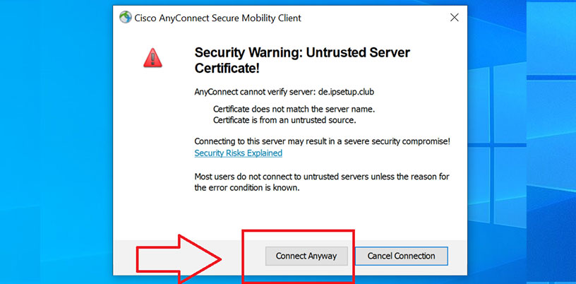 Untrusted VPN server certificate گواهی SSL سرور ناشناخته است روی Connect Anyway کلیک کنید